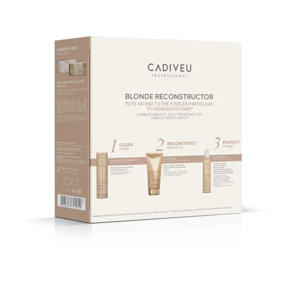 Get the complete treatment kit for bleached hair at home and achieve incredible strands with the Blonde Reconstructor Kit from Cadiveu Professional . With PEARL SHIELD technology, this kit is essential for those looking for deep hair reconstruction and protection against the five most common problems with bleached hair: breakage, frizz, yellowing, porosity and greening caused by swimming pools.